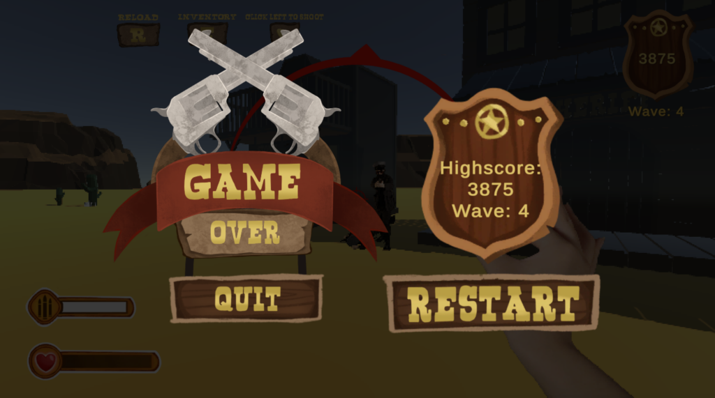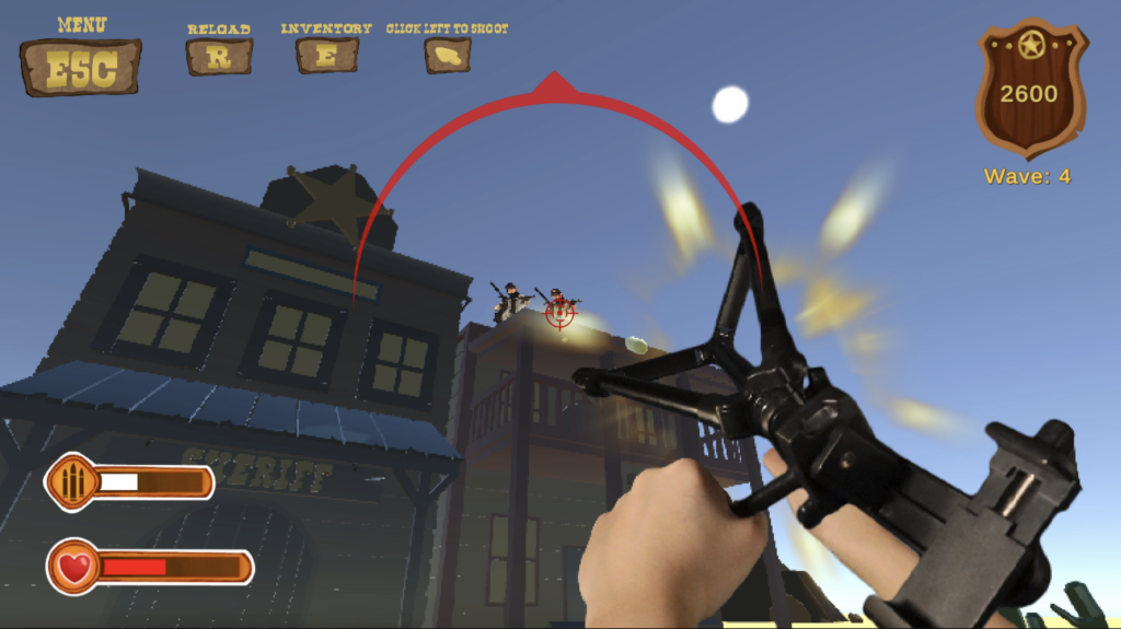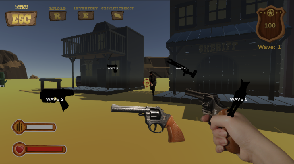 The game “Help! I’m being attacked by Cyborg Cowboys who are also Communists” is an arcade shooter, where the player shoots enemies by targeting them with an eye tracker. The aim is to survive as many enemy waves as possible.