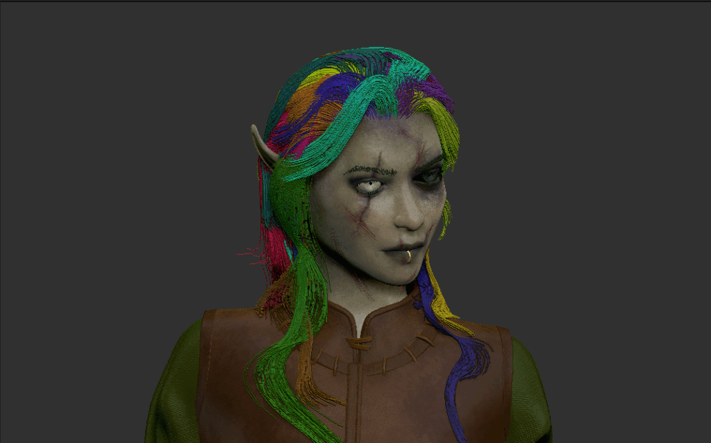 To create the hair, the Fibermesh was first generated and then divided into several polygroups. These individual strands were then shaped and colored one by one with groom brushes and the move tool.